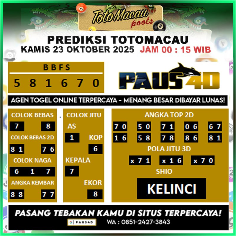 Prediksi Totomacau merupakan kunci keberhasilan dalam meraih angka akurat dengan cara mencari prediksi macau jitu agar bisa memenangkan toto macau hari ini. Prediksi Macau memberikan ramalan yang telah disusun oleh para ahli dalam dunia togel. Lalu disebarkan melalui platform resmi seperti Prediksi Togel Paus4d.